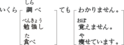 解釋:怎麼 調查 也 不懂。 ::::>有聲發音 用功 也 記不住。 ::::>有聲發音 吃 也 瘦瘦的。 ::::>有聲發音
